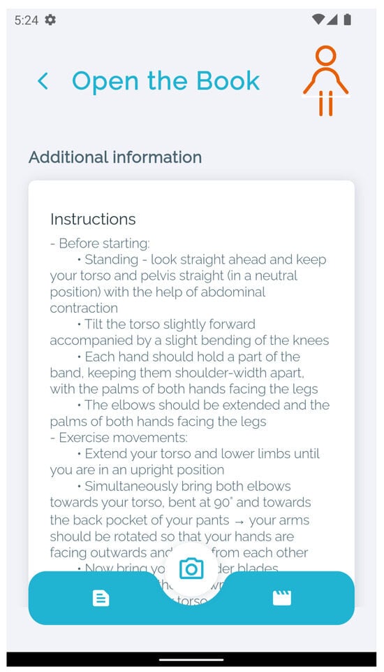 For each of the exercises, detailed instructions on all the steps are provided, including the time required to perform it and a demonstration video made by professional physiotherapists, where they demonstrate all the stages of the exercise step by step (Figure 2).