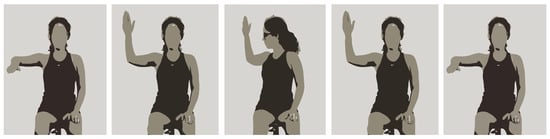The second corresponded to the movement of the arm when the participant was standing. The first stage of this exercise consisted of keeping the hand closed (punch position) and the shoulder internally rotated with the elbow extended on the side of the hip from the opposite side to the shoulder on which the exercise was being performed. After this, the participant was instructed to gradually open their hand while performing shoulder external rotation and elevation (simultaneously in frontal and sagittal planes), until it was at a 45° angle to their head. To finish, the participant was instructed to make the opposite movement to return to the starting position. This exercise is illustrated in Figure 5.