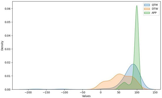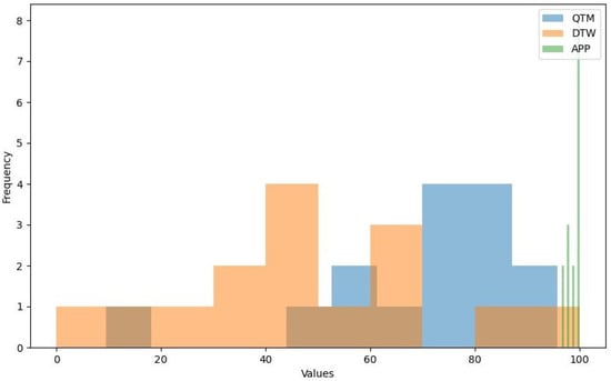 Considering the above, we present a comparative analysis of the three methods used for our exercises: QTM, the dynamic time warping (identified as “DTW”) method, and the cosine similarity method (identified as “APP”).