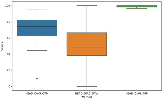 The data consist of measurements from six different exercises: HEAD_DIAG, TRUNK_DIAG, SHOULDER_DIAG, HEAD_ROT, TRUNK_ROT, and SHOULDER_ROT. These represent the measures of the diagonal exercises of the head, trunk, and shoulder and the rotational exercises of the head, trunk, and shoulder, respectively. For each exercise, we obtained measurements using the three methods. A density plot containing these measurements is presented in Figure 7. Figure 8 shows a histogram of the distribution of the values for the HEAD_DIAG exercise across the three methods. Figure 9 displays a scatter plot that visualizes the relationship between the QTM and DTW methods on the diagonal head exercise. Finally, Figure 10 shows a box plot with the values for the diagonal head exercise across the three methods.