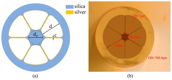 Figure 1a shows the structure of the proposed silver-coated LSCF with an outer diameter of approximately 760 μm. The geometry used here consists of six air holes surrounding a hexagonal silica core. The fabrication of this type of fiber relies on stacking six capillaries into a silica jacketing tube and drawing this arrangement into the fiber. A microscope image of the cross section of the fabricated LSCF is shown in Figure 1b. The core section is suspended by six struts of an approximate thickness of 2 μm, which guarantee the mechanical strength of the fiber. The core diameter dc is around 100 μm, which is defined as the diameter of the largest circle that can be inscribed in the core region. The light is constricted to guide in the solid core by the effective index contrast between the core and the surrounding air holes. A silver layer with thickness around 50 nm is coated on the inner surface of the air holes of the LSCF to support the excitation of the SPR phenomenon. Due to the large air holes with diameter around 230 μm (radial), the high-pressure condition is not needed during the silver layer deposition process. When appropriate light is transmitted in the solid silica core, SPP would be excited and electromagnetic field enhancement would occur at the interface between the analyte in the air holes and the silver layer adjacent to the silica core. Hence, the enhanced electromagnetic field caused by the SPR phenomenon would further enhance the Raman scattering signal of the analyte absorbed on the silver layer surface.