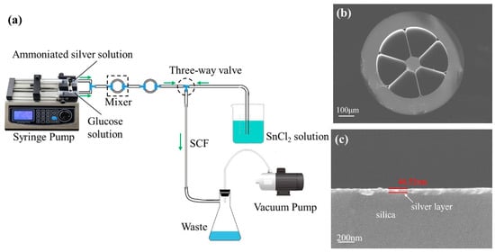 In brief, the improved liquid-phase deposition method was employed to coat a dense silver layer on the inner surface of the LSCF [40], as shown in Figure 2a. More importantly that the deposition time, the flow rate of solutions and temperature must be carefully controlled to obtain a uniform and smooth silver layer. Before deposition, the inner surface was sensitized with a 0.01 g/mL SnCl2 solution for about 30 s. The Sn2+ ions that remained on the air hole surface shortened the plating time and improved the adhesion between the air hole surface and the silver particles reduced afterwards. Then, a layer of silver film was deposited on the inner surface of the holes. In our experiment, 5% ammoniacal silver solution in an alkaline solution (4% KOH) and 5% glucose solution were used as the plating and reducing agent, respectively. The solutions were then mixed and forced to flow through the air holes of the LSCF by the syringe pump at 5 mL/min flow rate, and the temperature was controlled about 16 °C. The silver-coated LSCF was carefully washed with deionized water and ethanol in succession by the vacuum pump and then blow-dried with nitrogen gas. Furthermore, a three-way valve was employed to switch the fluid path to either a syringe pump or a vacuum pump during the coating process. To characterize the morphology of the fabricated LSCF, a scanning electron microscope (SEM, Zeiss Gemini 300, Jena, Germany) was adopted. The SEM image of the whole cross section of the fabricated silver-coated LSCF is shown in Figure 2b. Then, the morphology of the deposited silver layer in the LSCF is shown in Figure 2c. It can be seen that a uniform silver layer has been coated on the inner surface of LSCF successfully. The average thickness of the silver layer is measured as approximately 46.52 nm. In addition, 10-cm-long pieces of fiber were cut off from the fabricated whole Ag-coated LSCF to be used as the sensor in the follow-up experiments.