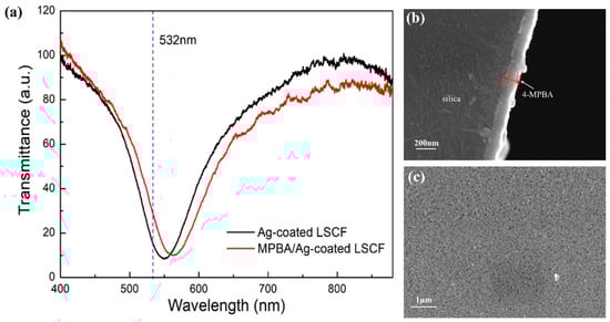 (a) Transmittance spectra of the LSCF before (black line) and after (red line) 4-MPBA modification. (b) SEM images of the cross section of the 4-MPBA monolayer on the surface. (c) Surface SEM morphology of 4-MPBA/Ag-coated LSCF.