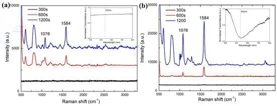 To demonstrate the SERS sensing ability of the proposed LSCF sensor, the Raman scattering spectra of the 4-MPBA/Ag-coated LSCF under the non-enhanced and SPR enhanced cases were both measured with different exposure time for comparison. The Raman scattering spectra of the 4-MPBA/Ag-coated LSCF under the non-enhanced case is shown in Figure 7a. Here, the air holes of the LSCF are filled with air. In such case, there is no SPR dip in the transmission spectrum as shown in the inset of Figure 7a, which indicates that the SPR phenomenon cannot be excited by the 532 nm laser. Thus, the Raman scattering signal is not enhanced. Two main characteristic Raman peaks of the 4-MPBA monolayer are located at 1076 cm−1 and 1584 cm−1, respectively. The strength of Raman scattering peaks increases with the exposure time. When the exposure time is 1200 s, the intensities of the characteristic Raman peaks at 1076 cm−1 and 1584 cm−1 are 1300 and 2450, respectively. The Raman spectra of the 4-MPBA/Ag-coated LSCF under the surface enhanced case are shown in Figure 7b. In this case, the air holes of the LSCF are filled with deionized water. As shown by the transmission spectrum in the inset of Figure 7b, the SPR phenomenon is excited. The SPR dip is located around 532 nm, which is indicated by dashed line in the inset. Therefore, when the 532 nm laser is transmitted through the solid core of LSCF, the SPR phenomenon is excited, and an electromagnetic field enhancement occurs at the surface of the silver layer where the 4-MPBA monolayer is located. Then, the signal strength of the Raman scattering is enhanced. The strength of Raman scattering peaks also increases with the exposure time. In the Raman scattering spectrum for the exposure time of 1200 s in Figure 7b, the intensities of the characteristic Raman peaks at 1076 cm−1 and 1584 cm−1 are 11,300 and 15,400, respectively. Compared with the non-enhanced case shown in Figure 7a, the Raman scattering signal strength of peaks at 1076 cm−1 and 1584 cm−1 were enhanced 8.7 and 6.3 times, respectively. These results indicate that the Raman scattering signal of the 4-MPBA assembled on the silver surface in the silver-coated LSCF was successfully enhanced by the SPR phenomenon excited in the LSCF. Therefore, the proposed silver-coated LSCF sensor possesses the capability of SERS sensing.