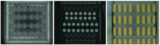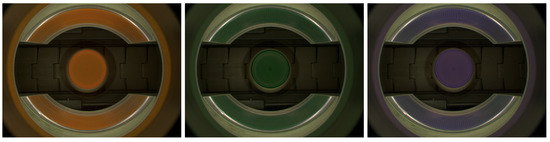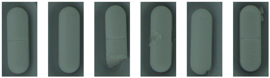 Two other datasets contain data collected on different production lines from different manufacturing domains: pharmaceutical and food markets. The first dataset contains images gathered by our vision system installed on machine for packaging pharmaceutical pills in blisters. The images of single pills are cropped from a full image based on predefined regions. Across the machines integrated with our optical quality control system, a diverse array of pills and capsules are packed into blisters, varying in terms of size, geometry, and coloration (Figure 2). Our anomaly detection system works for all pill–blister combinations. Images in the second dataset were acquired on the beverage production line. Our quality control system detects faults in bottle caps; a 360-degree image of the bottle cap is captured with a single camera. The caps, which are visible on mirrors, are remapped to rectangular images. See Figure 3 and Figure 4. The sizes and colors of controlled caps differ for different beverages, but all of them are controlled with our anomaly detection system (Figure 1). Both datasets preserve the same test and train set structure as each MVTec AD category.