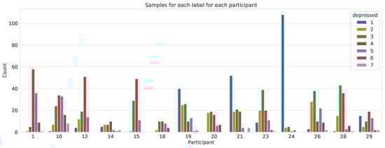 Moreover, the feature depressed with a value between 1 and 7 was used as the output feature. The severity of the depressed mood increases from 1 to 7, with 1 indicating feeling not depressed and 7 indicating feeling severely depressed. The datestamp feature was used to order the dataset chronologically before any data preprocessing was performed. Table 2 contains sample information for each participant, and Figure 1 shows the output-label distribution for each participant.