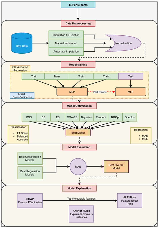 The proposed mood-score-prediction framework for the MLP models discussed in this paper. This framework is repeated for all 14 participants. We begin at the top with data preprocessing. The preprocessed data are then used to train classification- and regression-based MLP models. The best models from the classification and regression training (using 5-fold Cross-Validation) and optimisation are compared to find the best overall models with minimum Mean Absolute Error (MAE). This best overall model is then used to obtain model explanations by using SHAP, ALE plots and Anchor rules.