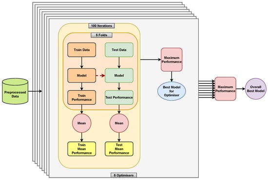 The optimisation procedure shows how the 5-fold Cross-Validation scheme is repeated for 100 iterations for each of the eight optimisers. Different metrics are used to find the best model for the optimiser based on whether the model trained is a classification or a regression model. Similarly, we use different metrics to find the overall best among the eight best models from the optimisers.