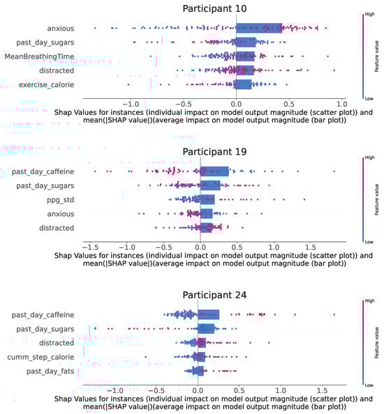 Figure 4 shows the five features from the wearable- and EMA-acquired features that affect the model prediction the most based on their SHAP values for three example participants. Plots for all participants can be found in Appendix A.5. SHAP explains a prediction (a single prediction) of a data instance by computing the contribution of each feature to the prediction. We take the mean (average) of the absolute SHAP values for all instances in the dataset and sort them to find the top five features in the figure.