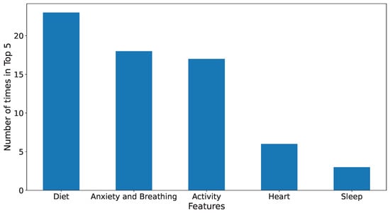 Figure 5 further shows the overall (population level or for all participants) top feature groups ranked by the number of times they appear in the top-five features, i.e., by their frequency. The figure shows that diet-related features, such as past-day-sugars, past-day-fats and past-day-caffeine, have the highest effect on mood-score prediction. This is followed by anxiety-based features (measured through features like anxious, distracted and MeanBreathingTime). Physical-activity-based features (such as cumm-step-count and cumm-step-calorie) have an effect similar to anxiety-based features. Heart- and sleep-based features are the least frequent top-five features and, hence, seem to have the lowest effect on mood scores.