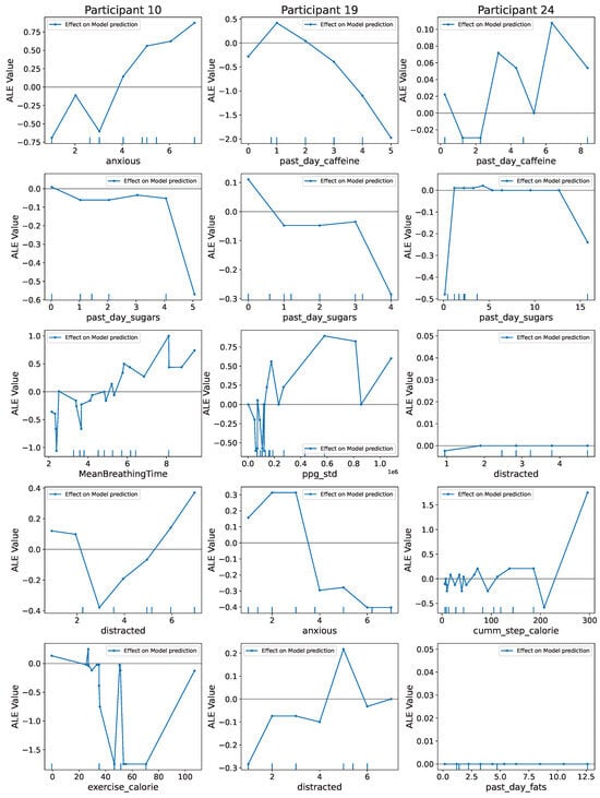 The figure shows the Accumulated Local Effects (ALE) plots for the top-5 features in the overall best models for Participants 10, 19 and 24. The x-axis contains the feature values, and the y-axis contains the ALE values. The ALE values denote the magnitude of the average effect of a feature value on the model output, i.e., the mood score. Plots for all participants can be found in Appendix A.5.