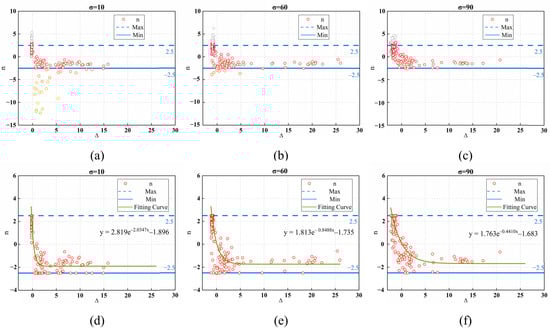 Results of Δ and for 64 images on the Texture dataset under two noise levels. The blue solid line is the minimum allowable value of , and the blue dashed line is the maximum allowable value of . (a–c) Experimental results of A under different noise levels (, , and ) (d–f) Corrected experimental results (, , and ) and their fitted curves.