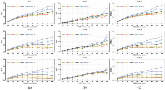 This nonlinear regression model is just an example for solving the problem and other regression models will also serve this purpose. Figure 3d–f demonstrates that the parameters of the regression equation change somewhat at different noise levels. To explore the relationship between the parameters , , and of this nonlinear regression model and the actual noise level, we use the nonlinear regression method for and under different noise levels. The obtained model parameters are shown in Figure 4.