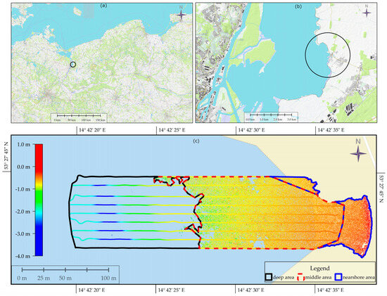 The black circle (a,b) marks the study area that includes a section of Lake Dabie located in Czarna Laka. The study area (c) and the studied hydroacoustic and photogrammetric datasets and depths are presented on a hypsometric scale [7]. The study area is divided into deep, middle, and nearshore areas, and the extents of these areas are marked by black, red, and blue lines.