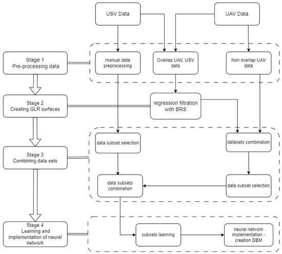 The application of neural networks requires the preparation of a training sequence on the basis of which the network can be trained, and in the final phase, a model can be created. The authors of this study investigated the possibility of using partial optimization of the training set to reconstruct the bathymetric surface created from hydroacoustic and photogrammetric data; this constitutes a new contribution to the field of research related to the creation of hybrid surfaces in shallow water areas. Partial optimization is the result of the combined overlap of hydrographic and photogrammetric measurements. Another aspect of the research is the method of fusing data from unmanned surface vehicles (USVs) and unmanned aerial vehicles (UAVs). From the conducted research and proposed data processing methodology, a new approach to point cloud filtration using generalized linear regression [47] was proposed after conducting a series of different experiments, with the elimination of outliers or a reduction in the measurement points in the dataset.