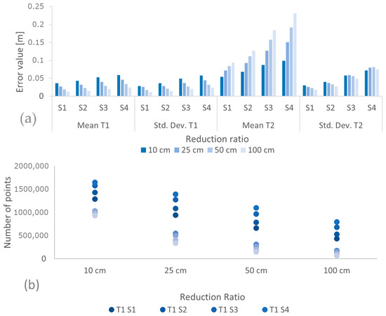 Summary of photogrammetric point cloud reduction results: (a) mean values and standard deviations, (b) number of points in datasets.
