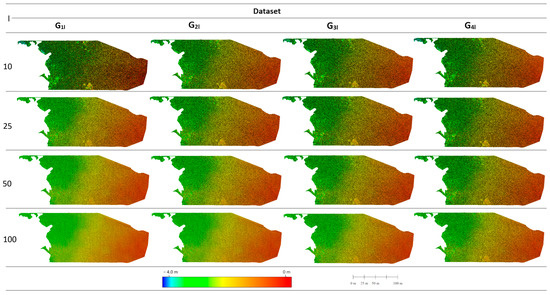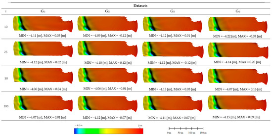 Figure 8 summarizes the surface representations of the neural digital bathymetric models (NDBMs) generated by the MLP neural networks. All of the surfaces created, regardless of the statistical set or level of reduction used, were quite similar, especially in the nearshore and middle parts, which are areas that are relatively flat and characterized by a slight gradual decrease in depth. The greatest changes occur in the deepest part within the local depression, where it is easiest to see the differences in the created NDBMs. A characteristic feature of the created NDBMs is the lack of surface roughness; this is a result of the processing methodology and the pixel size used (1 m). The consequence of this approach is the inability to recognize bottom changes smaller than the size of the pixel. Figure 8 also summarizes the minimum and maximum depths for the created surfaces. The minimum values obtained on all models are in a similar range and extend from −4.22 m to −4.06 m. The maximum values on the models are characterized by a much larger distribution; the highest maximum value was obtained for the set G4l, l = 25 with the value of 0.20 m, and the lowest maximum value was obtained for the set G2l, l = 10 with the value of −0.12 m.