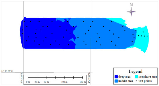 The test dataset consisted of 61 points (n) that were measured using the hydroacoustic (56 points) or GNSS-RTK technique (5 points) and did not participate in previous processing; these points were a separate independent dataset. The test dataset, like the data processing area, was divided into three parts: nearshore, middle, and deep. The nearshore part contained five test points; the middle part, twenty-eight points; and the deep part, also twenty-eight points. The distribution of the test points and the processing area is shown in Figure 7. The statistics for the set were as follows: maximum value of −0.47 m, minimum value of −3.92 m, mean value of −1.29 m, and a standard deviation of 0.87.
