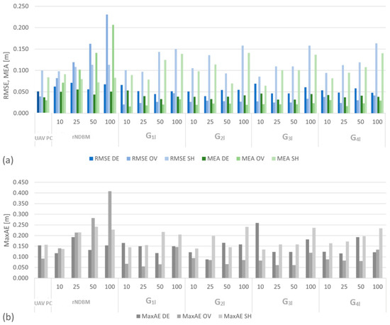 Analyzing the MAE, it can be observed that the largest values of this error occur for the middle part (MAE OV) on the rNDBMs, while in the remaining 16 NDBMs for this part, the values of the MAE error are considerably lower than the values of this error for the nearshore part (MAE SH) and the deep part (MAE DE). The MAE assumes the largest values for the nearshore part (SH) in the filtered sets, regardless of the reduction ratio and the statistical set. For the deep part (DE) and filtered sets, the MAE always has values larger than those on the middle part (OV); a similar trend of this error can be observed for the errors obtained for the original set (UAV PC).