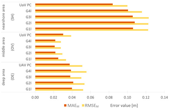 The MAEM errors also assume the smallest value for the middle part of 0.02 m. The largest value for the nearshore part is 0.11 m, with a value of 0.04 m for the deep part. Comparing the average of the RMSE and MAE for the statistical sets and the original set of the UAV PC, it can be seen that for the middle set, these errors take values larger for the original cloud than for the subsequent filtered datasets. Regardless of the assumed statistical set, it can be observed that the filtered middle part has the smallest error values.