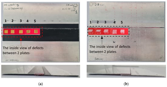 Pictures of single-lap joints with (a) brass inclusions; and (b) delaminations.