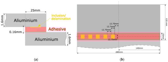 Aluminum single-lap joints manufactured at Cotesa GmBH, Germany, were used for the investigation. Two plates of aluminum 2024 were bonded using a 3M Scotch-Weld structural adhesive film AF 163 k. One sample was produced with brass inclusions between the aluminum sheet and the adhesive layer and another sample was produced with delaminations on the interface. The delaminations were produced using the Wrigtlon 4600 release film. The release film was double-folded in order to obtain an air gap between the two layers. The defects were rectangular. Defects in the case of brass inclusions and delaminations were the same size, 12.7 mm in length and width. The dimensions of the sample and the defects are presented in Table 1. Pictures of both samples are shown in Figure 1 and the schematics of the joint are shown in Figure 2.