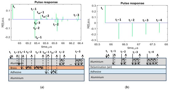 Pulse responses of the signal reflections from the sample boundaries and ultrasonic wave propagation paths: (a) aluminum joint with brass inclusions; and (b) aluminum joint with delaminations.