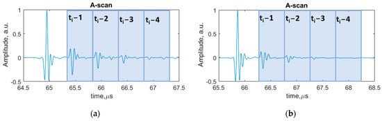 After conducting the experimental investigation, the data were collected and analyzed using MATLAB software. The A-scans at the selected points of the sample surface were analyzed and displayed. From the previous works performed [2], it was found that an analysis of multiple interface reflections one by one improves the probability of interface defect detection. Therefore, in this study, the performance of each ultrasonic feature will be investigated for the time intervals that correspond to multiple interface reflections, which were determined using signal modeling (Figure 3; Table 2). A-scans with indicated time intervals for multiple interface reflections are shown in Figure 5.