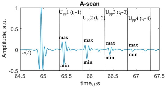 Ultrasonic features and their mathematical expressions are presented in Table 3. All listed ultrasonic features were calculated in time intervals of 4 repeated multiple reflections from the interface (Figure 5). An example of the calculation of the peak-to peak amplitude feature in time intervals of multiple interface reflections is shown in Figure 6. The remaining ultrasonic features were calculated accordingly. The ratio coefficients were calculated as the ratio of amplitudes of different time intervals of reflected signals from the aluminum–defect interface. The kurtosis feature characterizes whether the data are heavy-tailed or light-tailed in comparison to the normal distribution. Skewness measures the lack of symmetry of the signal. The standard deviation value measures how the data of amplitude in relation to mean value are dispersed. The variation coefficient value is a value between the standard error and the mean value. In the case of the time of flight feature, different thresholds were applied: 2%, −2%, 10% and −10%. The different values of thresholds were selected to calculate the time of flight within the gate at different levels of signal crossing.
