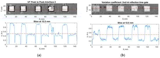All the listed features were extracted in the case of the samples with brass inclusions and delaminations. The evaluation of each ultrasonic feature performance was performed using the −6 dB drop method. This method includes monitoring the reflected signal from the defective interface, which first reaches its maximum and then drops to 50% at the edges of the signal height. The point where the signal is located at half of the maximum peak of the ultrasonic A-scan is used to estimate the length of the defect. Consequently, flaw lengths were sized in the middle of the defects along the x axis. C-scans and slices of the intensity variation in the middle of the defects along the x axis (red dashed line), used to size each defect, are presented in Figure 7. In addition, the −6 dB level on the intensity variation in Figure 7 is also indicated with a red dashed line. These figures provide examples of defect sizing performed for peak-to-peak and variation coefficient features. The resulting C-scans of ultrasonic features, which presented the highest performance for both samples, as well as estimated the mean value of relative error of defect sizing compared to reference defect size, are presented in Table 4 and Table 5, respectively. During the experimental investigation, the measurement was performed 128 times and averaged in the TecScan system. The mean value of the relative error and the error range (standard error of the mean) were calculated on the basis of five measurements of the defects. The relative error percentage is calculated according to the equation