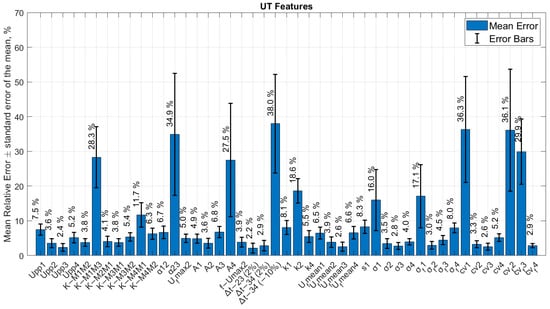 Bar graphs of all relative errors estimated for each ultrasonic feature are presented in Figure 8 and Figure 9. The results of defect size error calculation at multiple interface reflections are presented in Table 6 and compared.