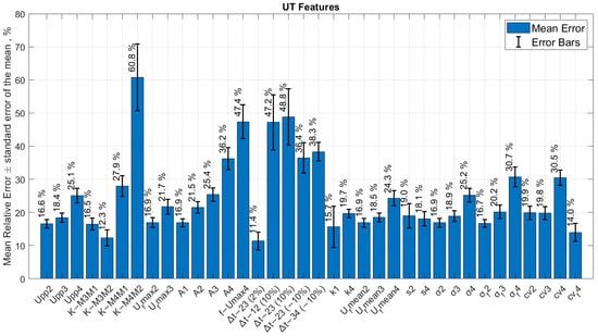 The bar graph of all ultrasonic features and relative errors of defect size (No. 3) in the sample with brass inclusions.