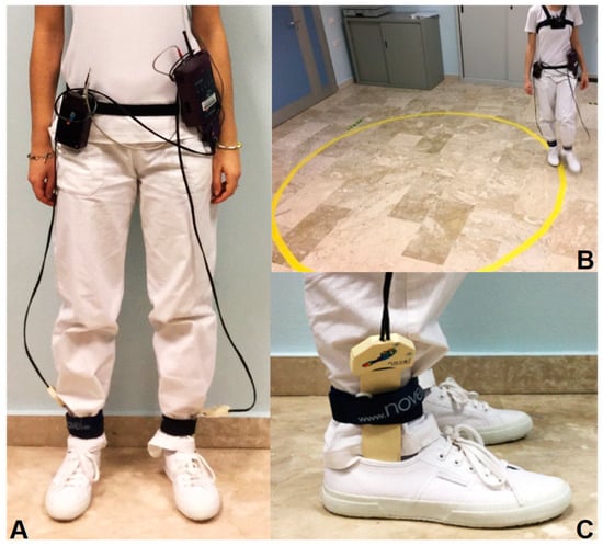 Photographs of the equipment and setup. (A) The subject is wearing the belt that connects the Pedar box to the plantar insoles (Pedar-X system, Novel), inserted into Superga shoes. (B) The subject completes the curved walking task. (C) Close-up of the insole system, showing the strap securing the cable.