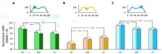 The average of normalized vGRF measured during a linear (lin) trajectory is the average of right and left foot values and curvilinear trajectories in the outer (out) and inner (in) feet. Lighter colors identified PwPD, while darker colors represented HS. Values are obtained from the peak of vGRF at initial contact (A, green colors), at mid-stance (B, orange colors), and at terminal stance (C, light-blue colors). Insets at the top show an example of a vGRF profile with representative peaks and a low phase. BW, body weight; SE, standard error; vGRF, vertical ground reaction force. ***, p < 0.001.