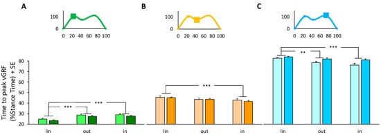 Average of the time to peak vGRF measured during the linear (lin) trajectory, as the average of right and left foot values, and curvilinear trajectories in the outer (out) and inner (in) foot. Lighter colors identified PwPD, while darker colors represented HS. Values are obtained from the time to peak of vGRF at initial contact (A, green colors), at mid-stance (B, orange colors), and at terminal stance (C, light-blue colors). Insets at the top show an example of a vGRF profile with representative peaks and a low phase. SE, standard error; vGRF, vertical ground reaction force. **, p < 0.004; ***, p < 0.001.