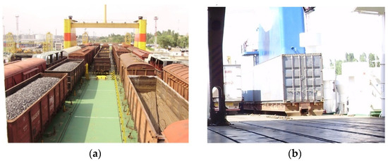 An example of rail vehicles transported by train ferries: (a) rail cars; (b) a container on a roll trailer.