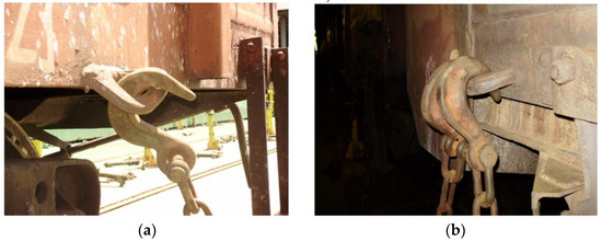 A scheme of fastening the researched open car on the deck: (a) Fastening the chain hook to the locking sector of the hatch cover; (b) Fastening the chain hook to the bracket for pulling up the wagon during shunting operations.