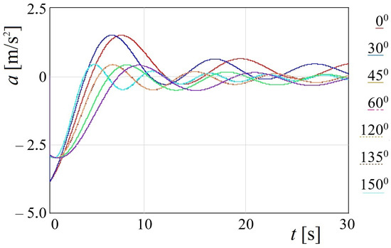 Figure 5 demonstrates that the maximum acceleration corresponds to a wave angle to the body of 0° and equals 3.6 m/s2. In this case, each colored line shown to the right of the graph in Figure 5 corresponds to a certain wave angle. The value of acceleration obtained was 37% higher than the operational value for the car on the main lines when the motion was estimated as admissible [25,26]. It is worth noting that this acceleration value was calculated for the car that was the farthest from the bulwark and located on the upper deck of the vessel. It should also be noted that mathematical model (1) was verified by means of the F-test, as presented in [27]. However, that model did not consider the influence of the wave on the vessel hull.