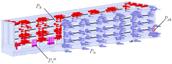 A scheme of the load acting on the open wagon main-bearing body structure is shown in Figure 7. This scheme includes the following loads: static load in the vertical direction Pvst, pressure due to transported bulk cargo Pb, dynamic, and wind Pw, and loads to the wagon body through the chain holders Pch. The dynamic load from chain binders and the pressure due to the bulk cargo to the bearing structure of the open wagon was included. The design diagram is shown in section for better visualization of the loads applied. When the wagon body is tilted, four ties on one side of the car absorb not only the preload (≈50 kN), but also the dynamic load, which was determined considering the result obtained from the mathematical model (1) acceleration. On the opposite side of the wagon, it was considered that the ties are loaded only by the preload.