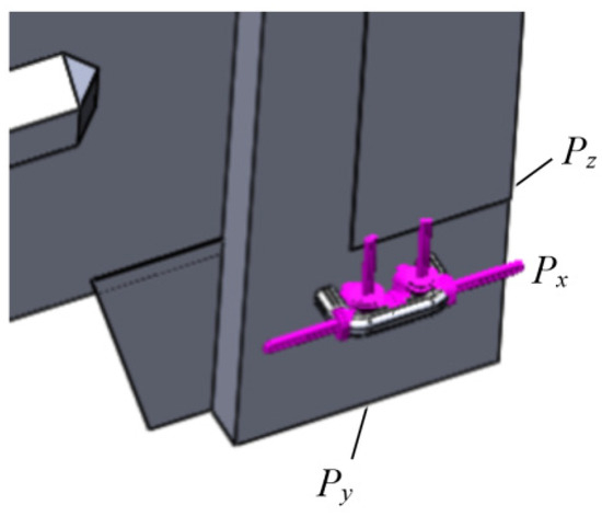 The strength analysis of the main-bearing structure of the freight wagon was calculated with consideration of the solutions proposed. The design diagram was similar to that given in Figure 7, except for the load to the main-bearing structure of the freight wagon through the chain binders, which was applied to the cylindrical parts of the unit.