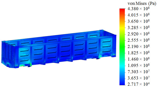 The analyses of the strength of an open wagon have been carried out by means of the FEM and the SolidWorks CosmosWorks Simulation version 2015 software (SolidWorks Corporation, Concord, MA, USA) was used for it. The results of the performed analyses are depicted in Figure 9, Figure 10 and Figure 11.