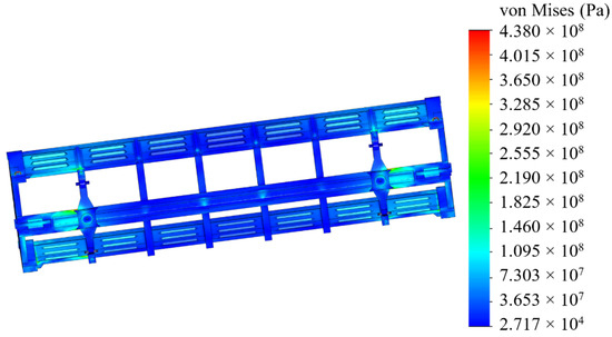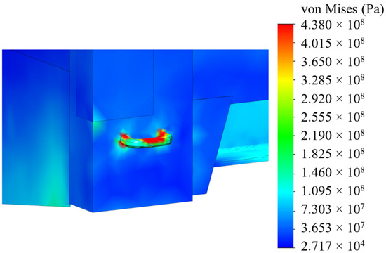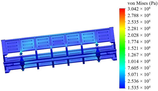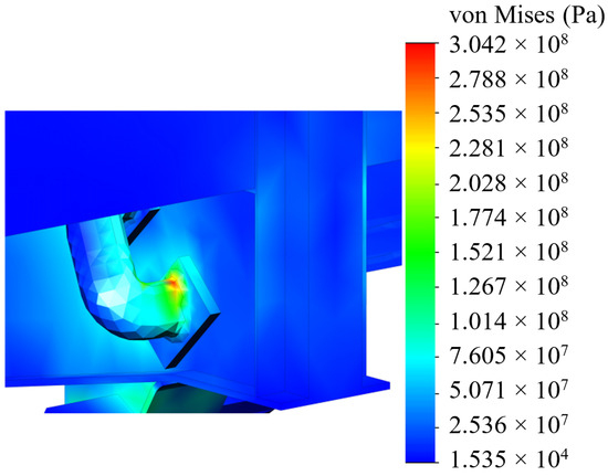 Figure 20 and Figure 21 depict the results of the performed simulation calculation. The maximum equivalent stresses were concentrated in the radial lug of the unit and amounted to 304 MPa. Thus, the permissible value [25,26] was not exceeded and was lower by 30% than those in the typical fastening scheme. Therefore, the sufficient strength of the open wagon main-bearing structure was preserved.