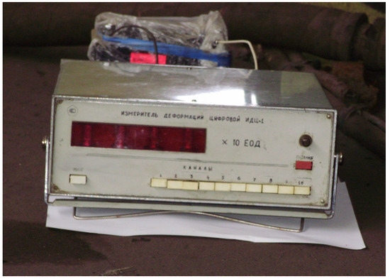 - A device for measurement of deformation gauges of construction and machine-building structures of VDC—1 (Figure 13); VDC—1 removes and converts the received information into values of physical quantities with subsequent display of information about the measured readings of the object, in this case—deformation. The device has an input polling time of no more than 1 s and one input (channel). The DC supply voltage range is 10.5–30 V. The maximum power consumption of the device is no more than 2 VA. The kit includes removable terminal blocks for easy installation and dismantling of the device. VDC—1 has the ability to receive information from strain gauges with different technical characteristics;