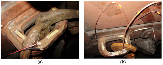 A scheme of placements of strain gauges placed on the tow bracket, used for pulling up the open car during shunting, is depicted in Figure 16. The readings of the strain gauges were recorded automatically. In this case, a special software was used. The readings taken from the sensors were converted into a table of values in Excel 2021 (Microsoft 365) software (Microsoft Corporation, Redmond, Washington, DC, USA). Based on the obtained sample, an analysis of the test results was carried out. The greatest values of relative deformations in the open car body were recorded by the set of strain gauges located on the closing sectors of hatch covers and the tow bracket for pulling up the open car. It was within the assumption that two chain hooks were attached to it, which amounted to 865 and 996 units, corresponding to the values of 178 MPa and 203.4 MPa, respectively (Figure 17).