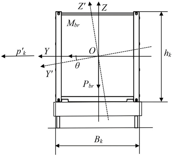 where Mrest—restoring moment value, Nm; Mdist—disturbing moment value, Nm; Mbr—gross mass of a container, kg; Pbr—gross weight of a container, kg; Bk—breadth of a container, m; nf—number of container fittings to support a container during the angular deflections considered relatively to the axle in the longitudinal direction; hf—height of the container fitting, m; θ—roll angle, °; —acceleration regarding the standard location of the container on the deck, m/s; hk—container height, m; —wind pressure acting on the container, Pa.
