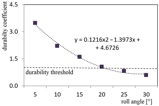 During their research, the authors obtained the dependency of the stability coefficient of a container located on a roll trailer on the roll angle of a train ferry (Figure 24).