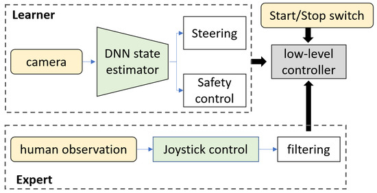 The imitation learning system. The learner feeds real-time camera input to the pre-trained DNN for state estimation. The estimated state is shared between the steering and the safety control policies for training. A start/stop switch is added to the joystick to turn on/off power to the motor driver immediately to stop the wheels in an emergency.