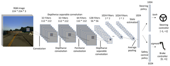 For the perception module, we use the convolutional filter layers of the MobileNet [47] (excluding the fully connected layers at last), which is pre-trained on the ImageNet [48] dataset. After initializing the CNN with the pre-trained weights, we carry out transfer learning using 5000 images from a simulated driving environment by freezing all the layers except the last two. The images used for transfer learning were generated using the CARLA simulation environment version 0.9.13. [49]. We used a scene camera available in CARLA fixed on the roof of an autopilot simulation vehicle to generate these 5000 R GB images. The images were generated on different environmental conditions consisting of different times of the day and weather conditions, and for each condition of the environment, a sample of 500 images were collected. During training, we randomly dropped neurons in the last layers with a rate of 0.5 to prevent over-fitting. Then, the CNN was connected to the learning networks for steering and safety control, as shown in Figure 2. The remaining convolutional layers are not subjected to any change during the learning or driving phases of the agent. MobileNet is a lightweight convolutional neural network that uses depthwise convolution. This allows MobileNet to have a reduced number of parameters with increased computational efficiency, making it a suitable candidate for resource-limited robotics environments.