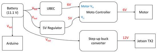 All of these systems were integrated (see Figure 3), and the signals were synchronized with ROS nodes for each component (see Figure 4). Communication between the Arduino Mega 2560 and the TX2 board was established through a serial communication protocol. This setup used the rosserial library, which bridged the Arduino platform with the ROS ecosystem, ensuring a seamless and standardized interface for data exchange and command relay between the microcontroller and the ROS-based system. To power the robot, an 11.1 V Lipo battery was used with battery elimination for different voltage levels required (see Figure 5).