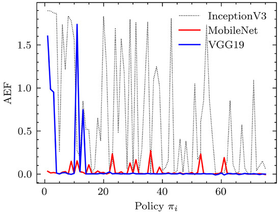 A better perception module architecture was expected to drop the AEF rapidly. As seen in Figure 6, performance with the InceptionV3 [51] network is irregular and often yields higher AEF values. Comparatively, MobileNet [47] and VGG19 [52] seem to perform well, and their performance is similar. It should be noted that we used single-layer dense architectures with 1024, 512, and 2048 parameters (plus a bias parameter) for MobileNet, VGG19, and InceptionV3, respectively, to accommodate their respective feature outputs. Despite the performance similarity, the VGG19 network has 20,024,384 parameters compared to 3,228,864 parameters in MobileNet. (These numbers correspond to the parameters in the respective pre-built Keras [53] models, taking only the convolutional filters). This translates to less memory and computation intensiveness of MobileNet compared to VGG19 while delivering similar performance with regard to the AEF and making the perception module lightweight.